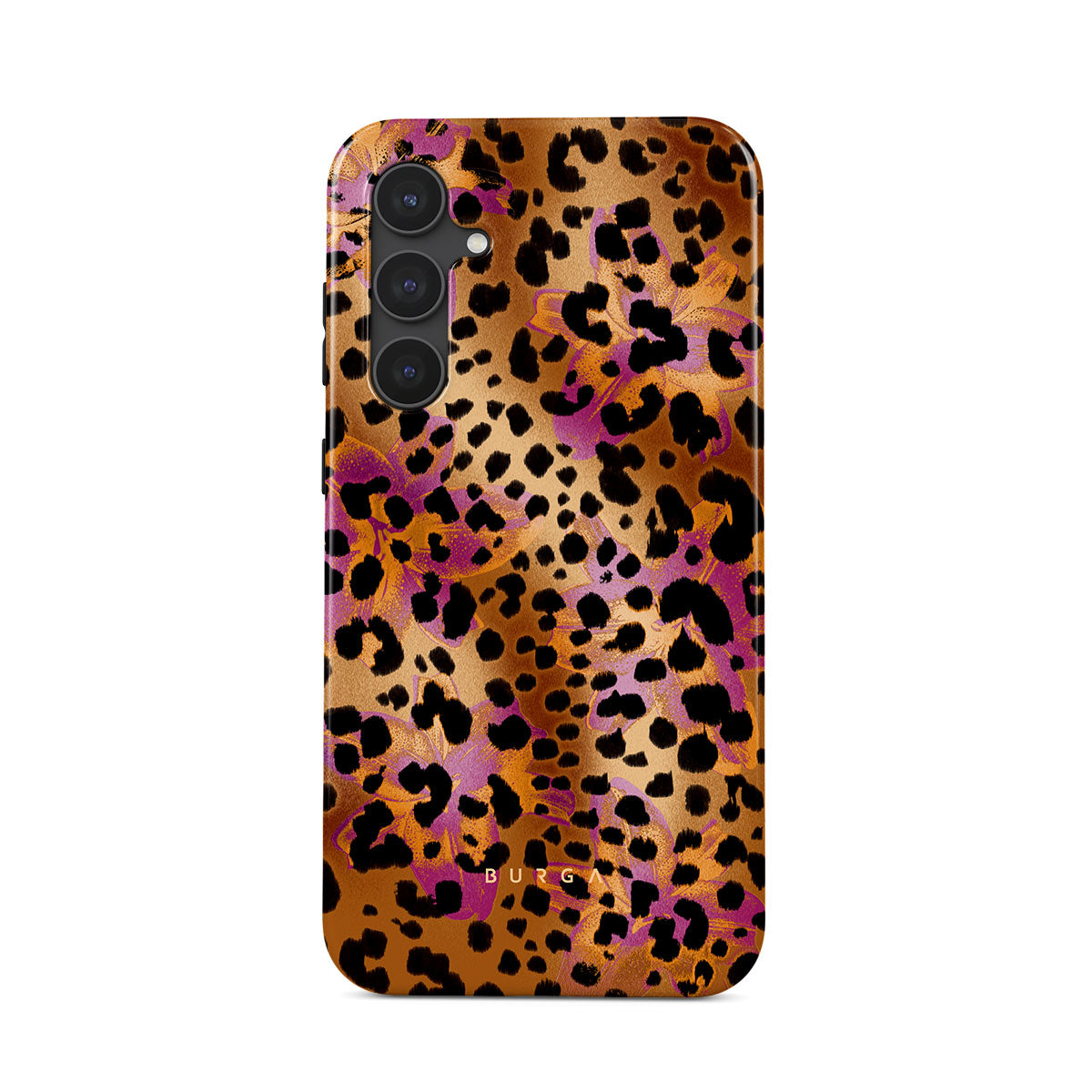 En este diseño: estampado de leopardo, marrón, naranja, morado, estampado animal.