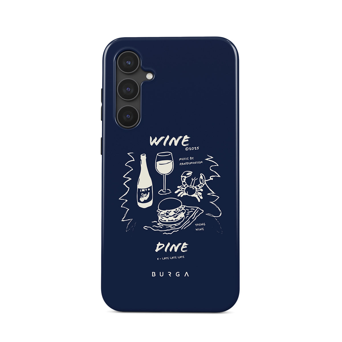 En este diseño: copas de vino, comida, gastronomía, ilustraciones minimalistas y texto