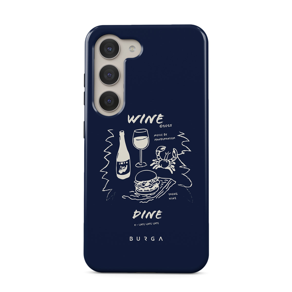 En este diseño: copas de vino, comida, gastronomía, ilustraciones minimalistas y texto