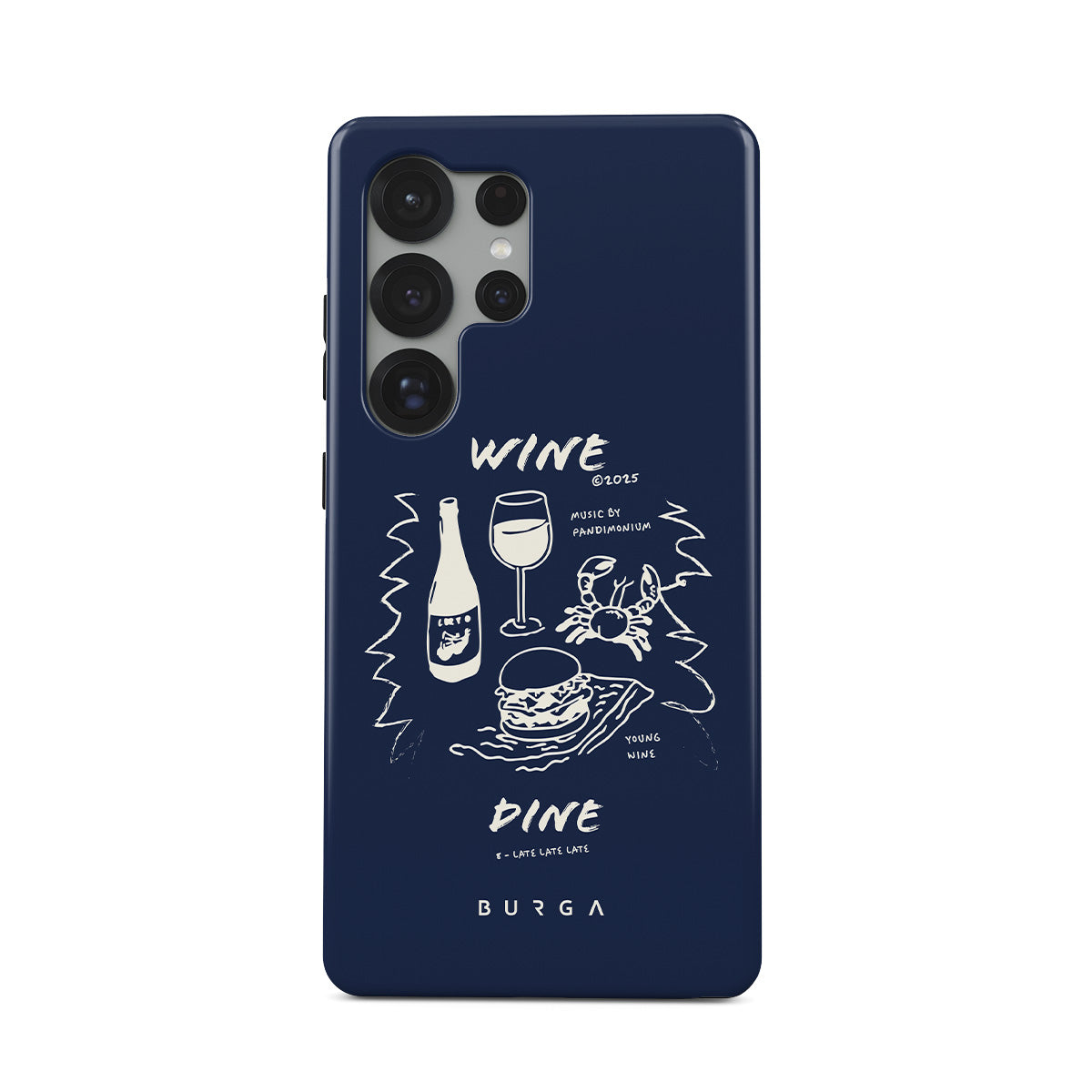 En este diseño: copas de vino, comida, gastronomía, ilustraciones minimalistas y texto