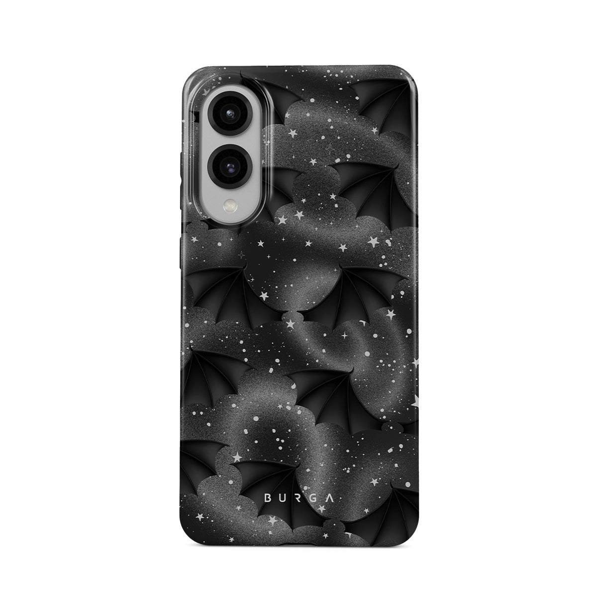 En este diseño: alas de murciélago, estrellas, remolinos místicos, cielo negro