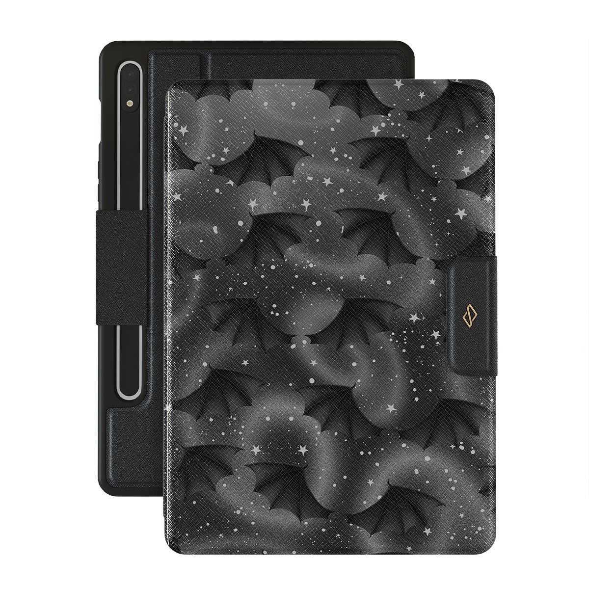 En este diseño: alas de murciélago, estrellas, remolinos místicos, cielo negro