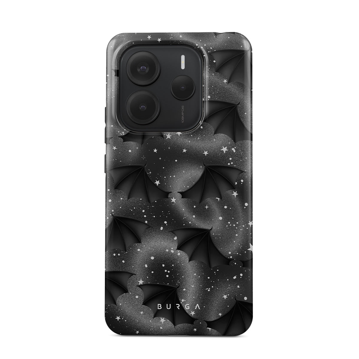 En este diseño: alas de murciélago, estrellas, remolinos místicos, cielo negro
