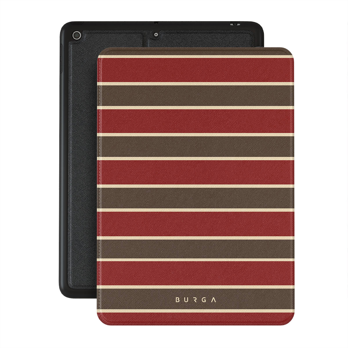 En este diseño: rayas rojas, rayas marrones, patrón clásico y patrón geométrico