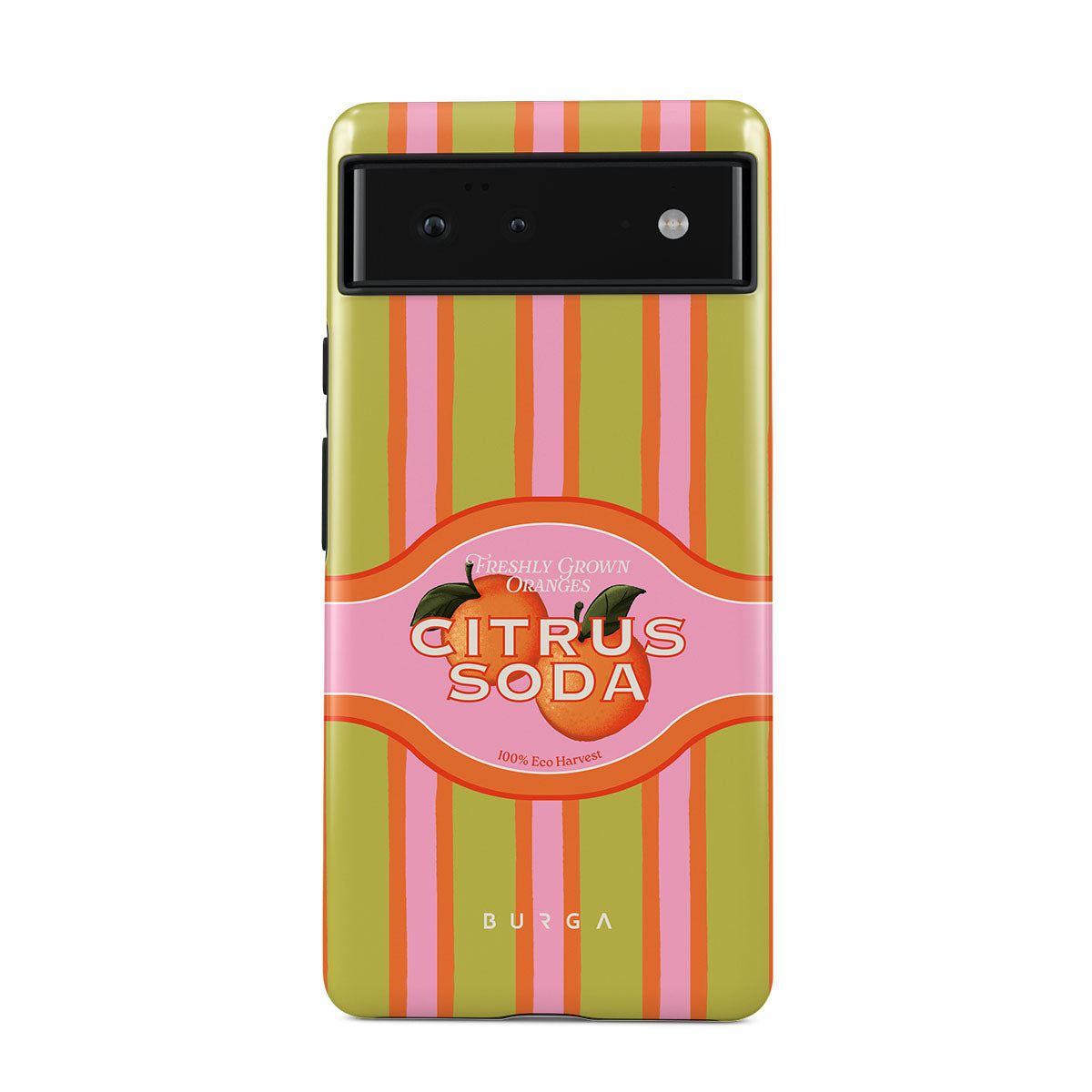 En este diseño: rayas de cítricos vibrantes, texto, plantas cítricas, mandarinas, pomelos