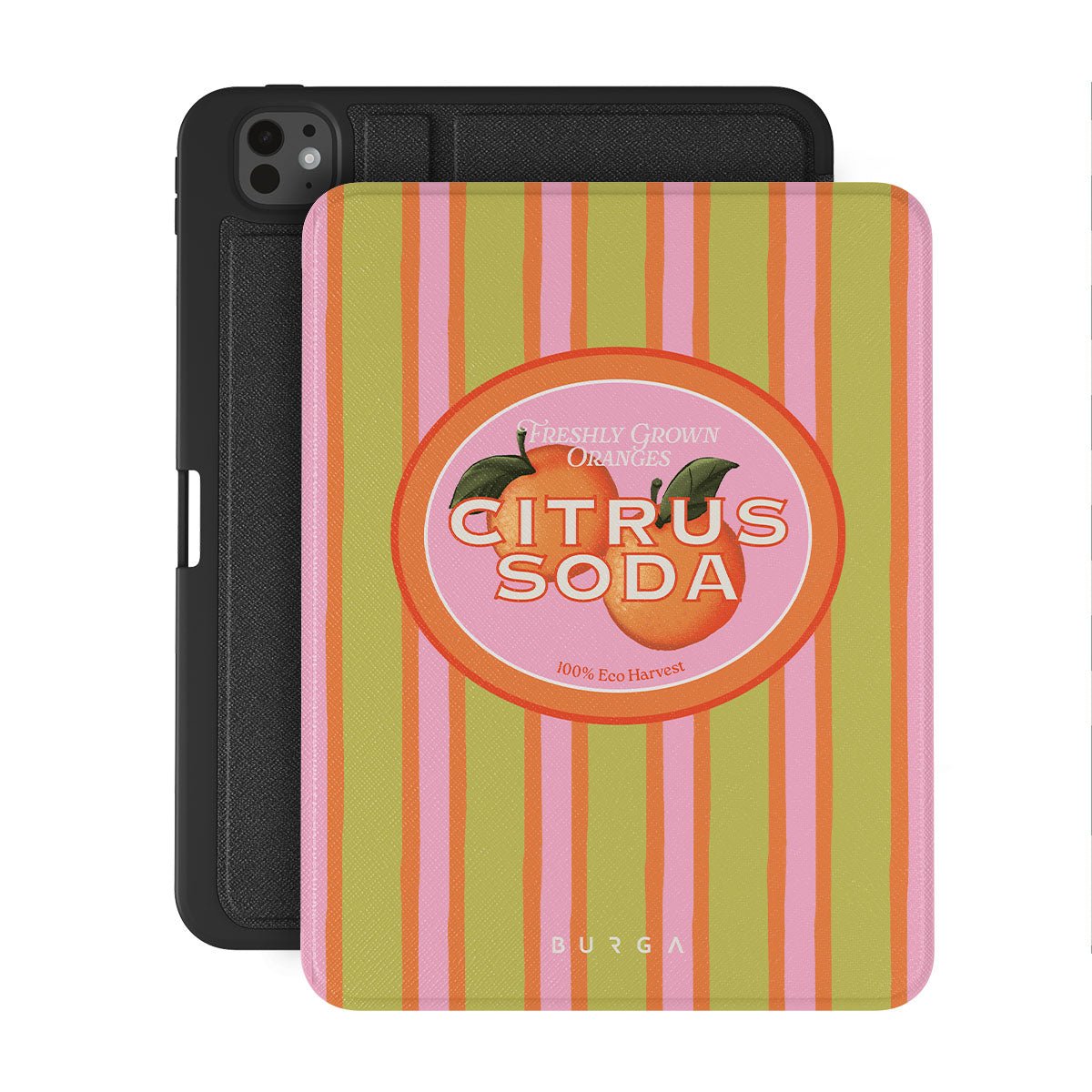 En este diseño: rayas de cítricos vibrantes, texto, plantas cítricas, mandarinas, pomelos
