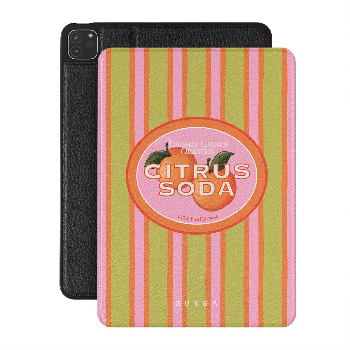 En este diseño: rayas de cítricos vibrantes, texto, plantas cítricas, mandarinas, pomelos