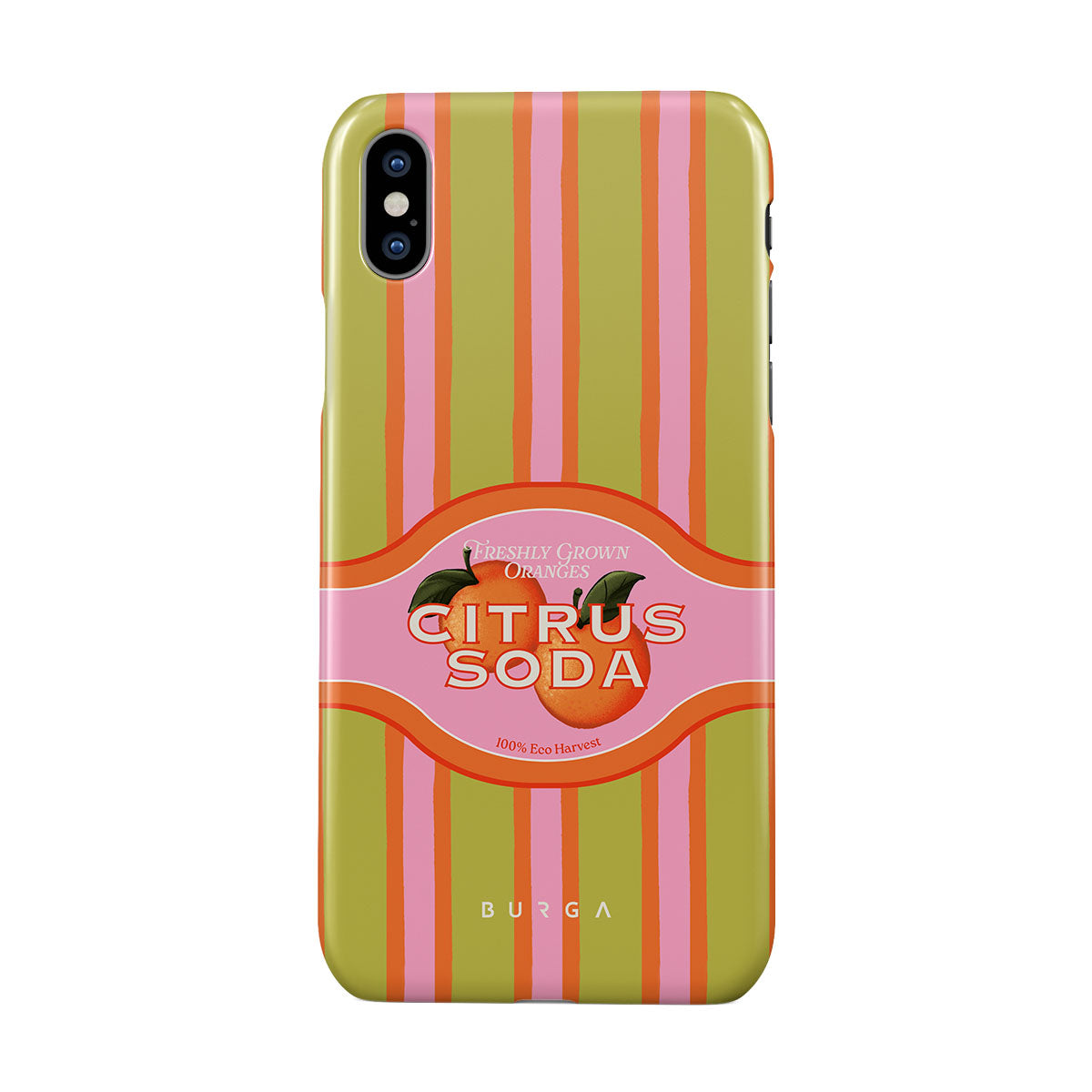 En este diseño: rayas de cítricos vibrantes, texto, plantas cítricas, mandarinas, pomelos