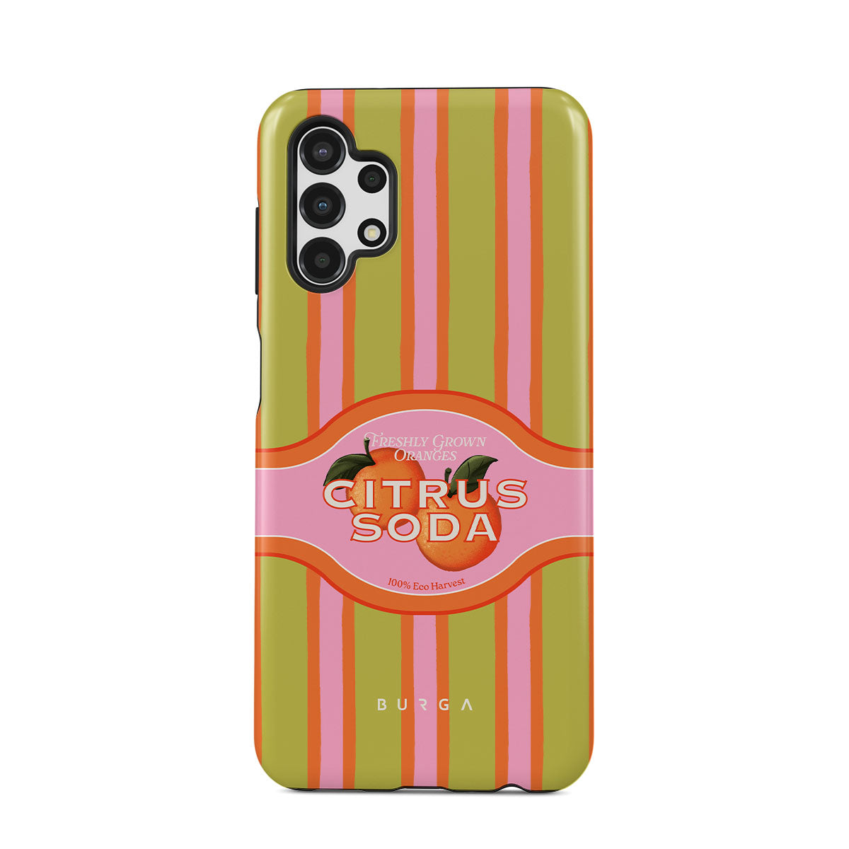 En este diseño: rayas de cítricos vibrantes, texto, plantas cítricas, mandarinas, pomelos