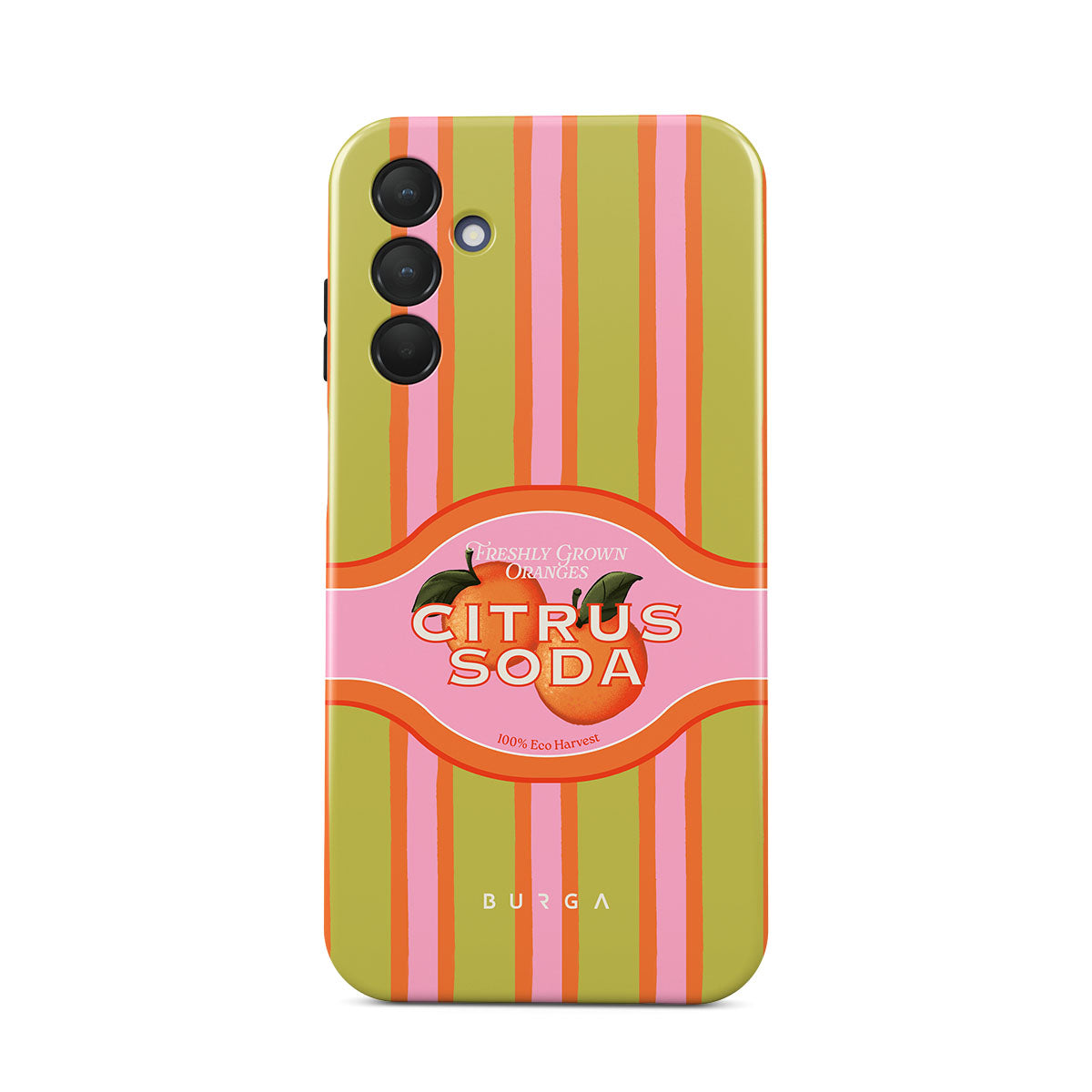 En este diseño: rayas de cítricos vibrantes, texto, plantas cítricas, mandarinas, pomelos