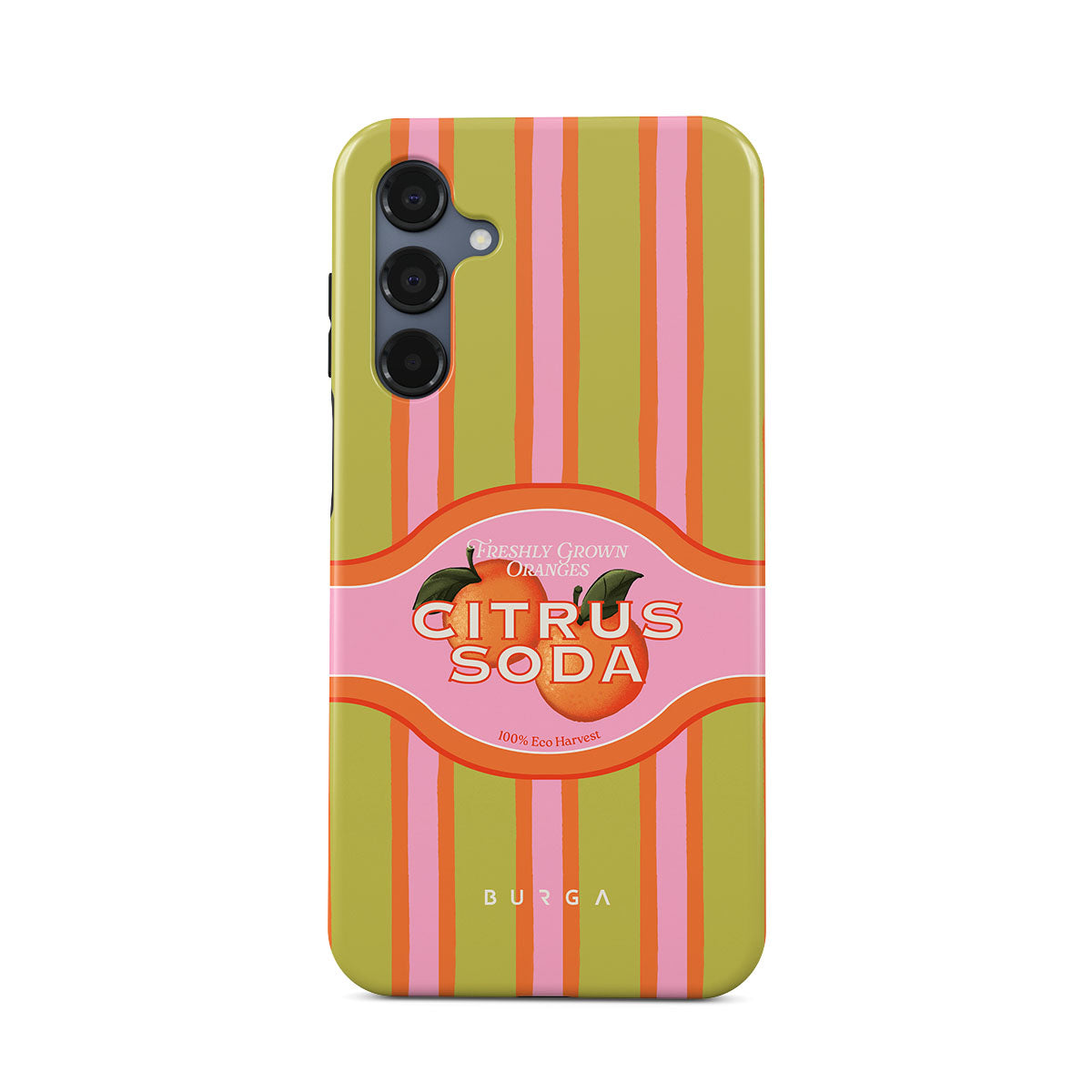 En este diseño: rayas de cítricos vibrantes, texto, plantas cítricas, mandarinas, pomelos