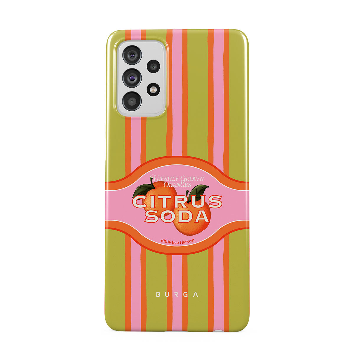 En este diseño: rayas de cítricos vibrantes, texto, plantas cítricas, mandarinas, pomelos