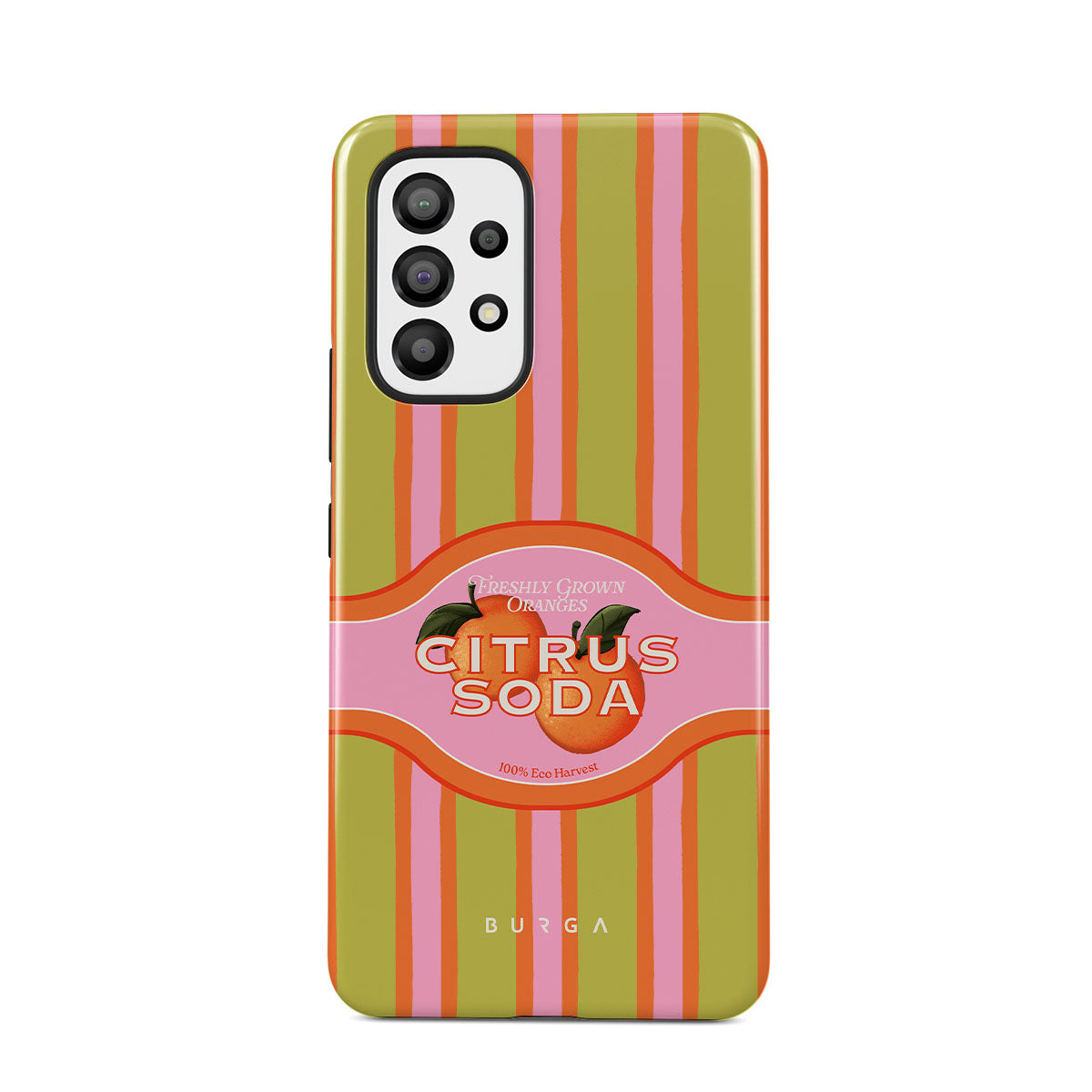 En este diseño: rayas de cítricos vibrantes, texto, plantas cítricas, mandarinas, pomelos