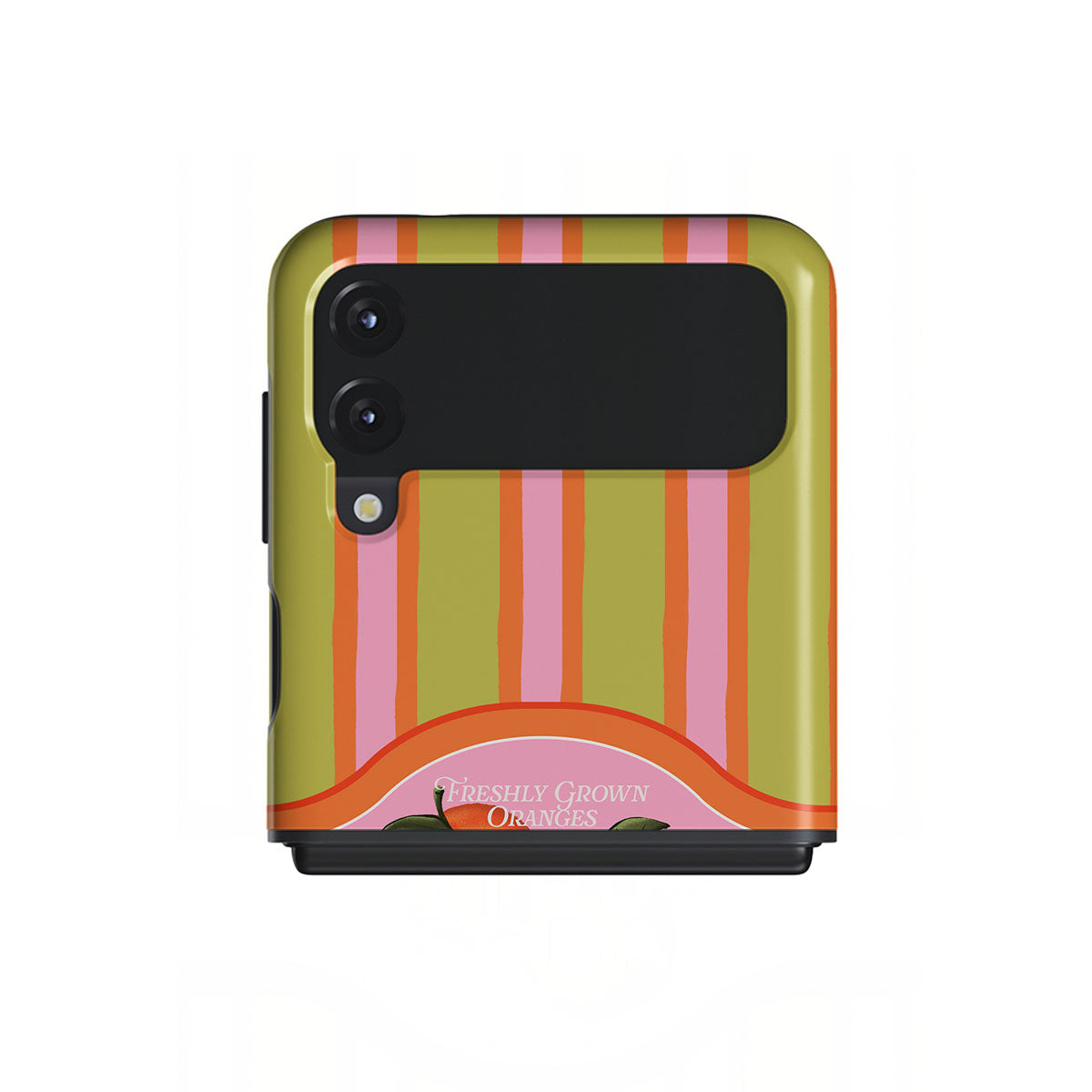 En este diseño: rayas de cítricos vibrantes, texto, plantas cítricas, mandarinas, pomelos